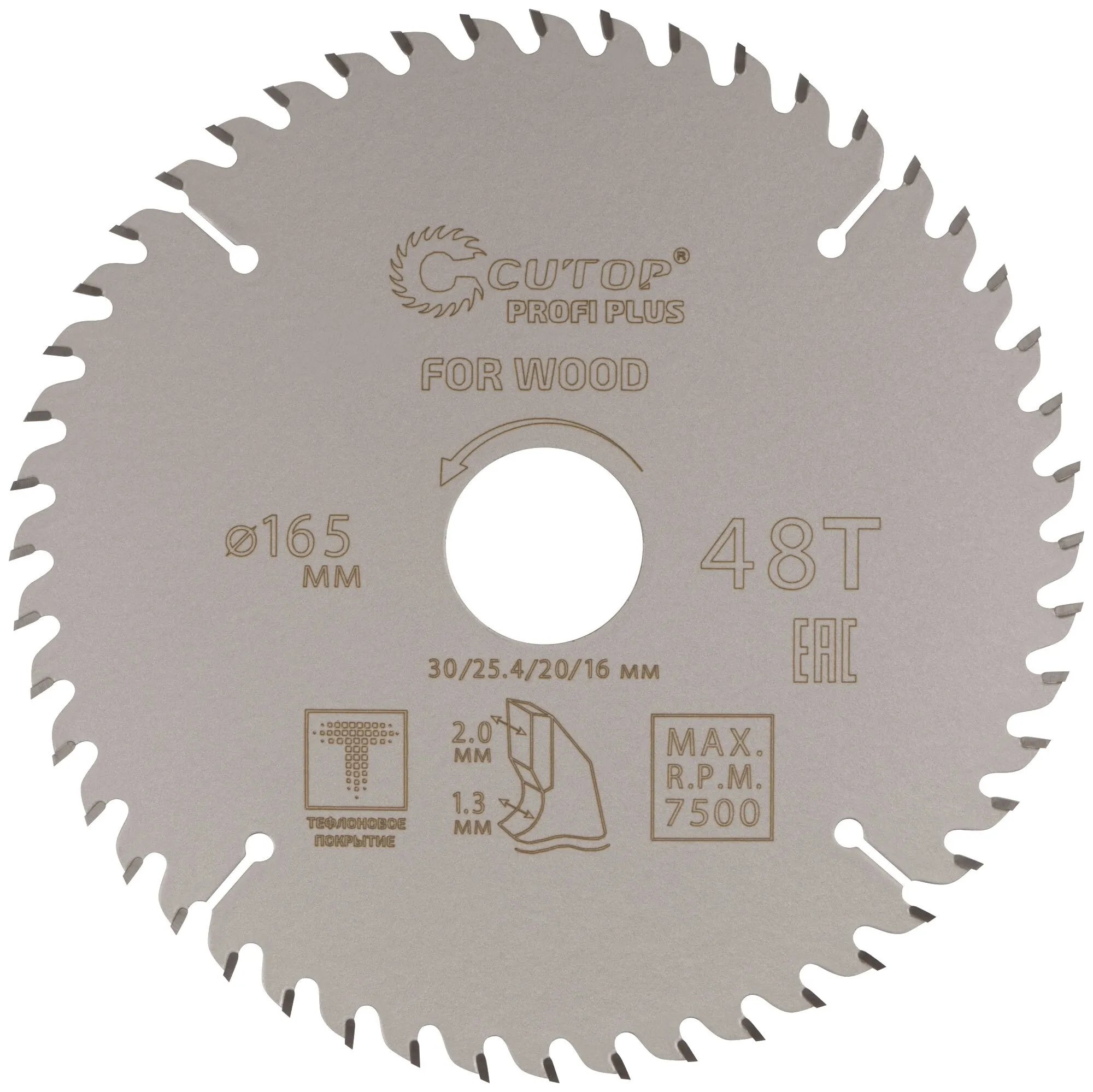 Диск пильный с тефлоновым покрытием по дереву Profi plus 165x1.3/2x30/25.4/20/16 мм, 48Т CUTOP 75-16548Т используется совместно с циркулярными и торцовочными пилами для продольного и поперечного реза. Предназначен для распила мягких и твердых пород древесины, МДФ, фанеры.