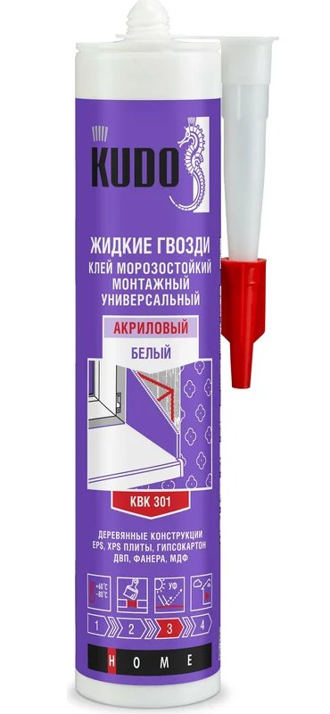 Универсальный монтажный клей-жидкие гвозди на акриловой основе KUDO 280 мл KBK-301 используют во время отделочных работ внутри помещений для сборки деревянных конструкций, приклеивания гипсокартона, OSB-плит, декоративных элементов, подоконников, утеплителей.