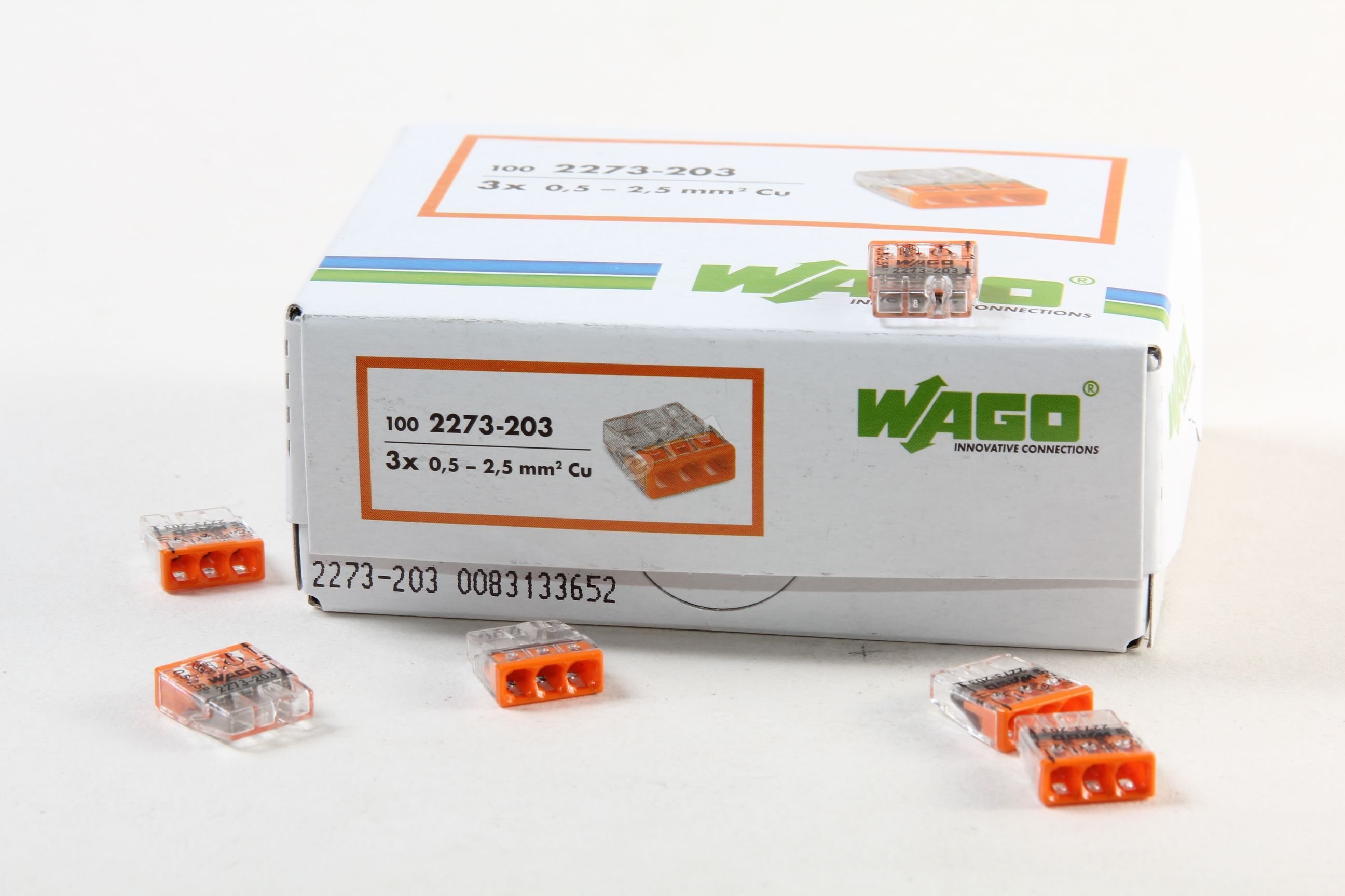 Клемма 3х(0,5-2,5мм)3-х проводн. для распред. короб.(без п.)WAGO 2273-203