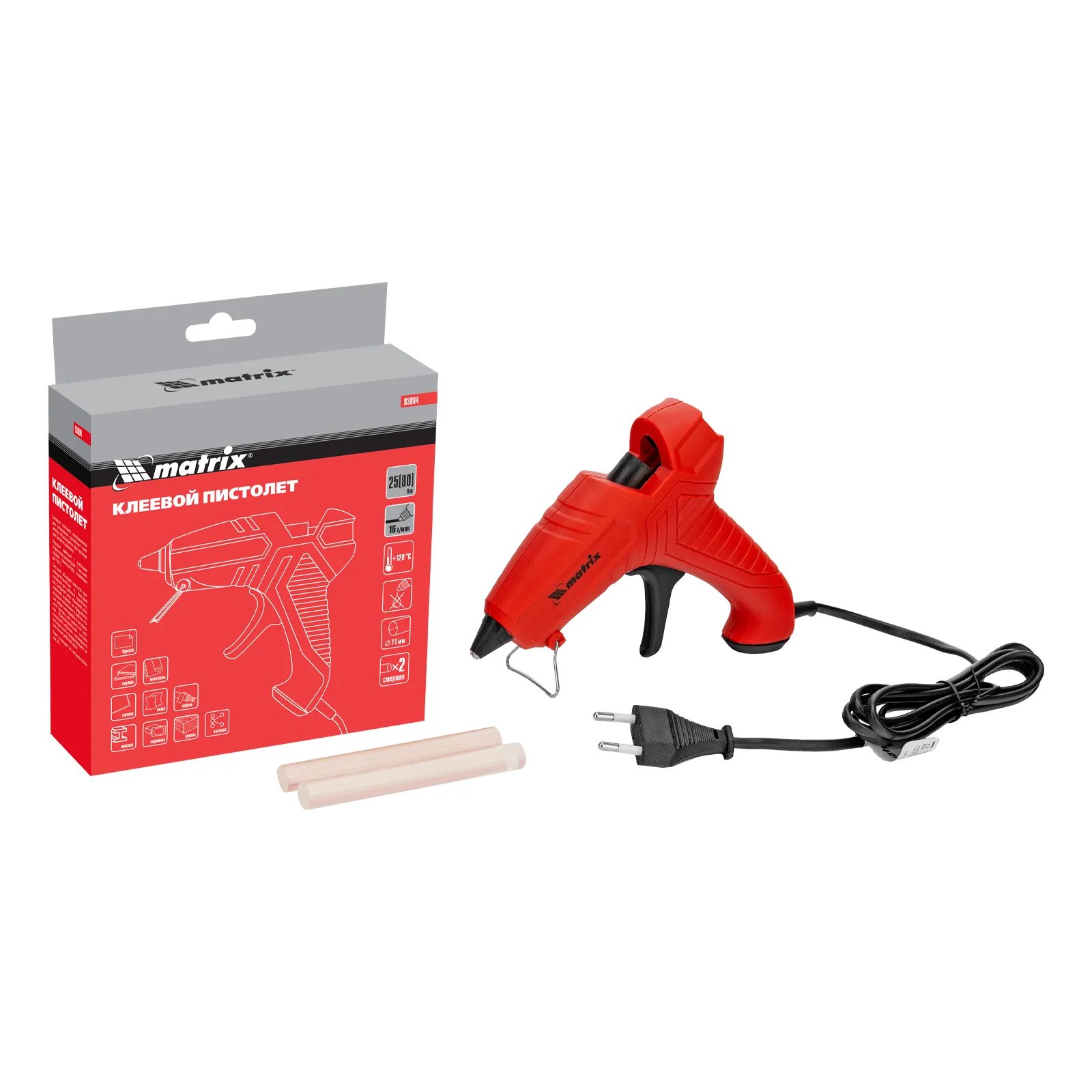 Клеевой пистолет Matrix 93004 потребляет мощность до 80 Вт, расходует 16 г клея в минуту и совместим со стержнями диаметром 11 мм. Позволяет склеивать бумагу, картон, текстиль, кожу, пластик и другие материалы. Время нагрева до рабочей температуры 120 °C — не более 6 минут, что позволяет быстрее приступить к работе. Инструмент используется для бытовых и полупрофессиональных нужд: выполнения мелкого ремонта, упаковки товаров, фиксации деталей, изготовления игрушек и объемных украшений, декорирования и т.д. Инструмент пригодится отделочникам, моделистам и тем, кто занимается хенд-мейдом.